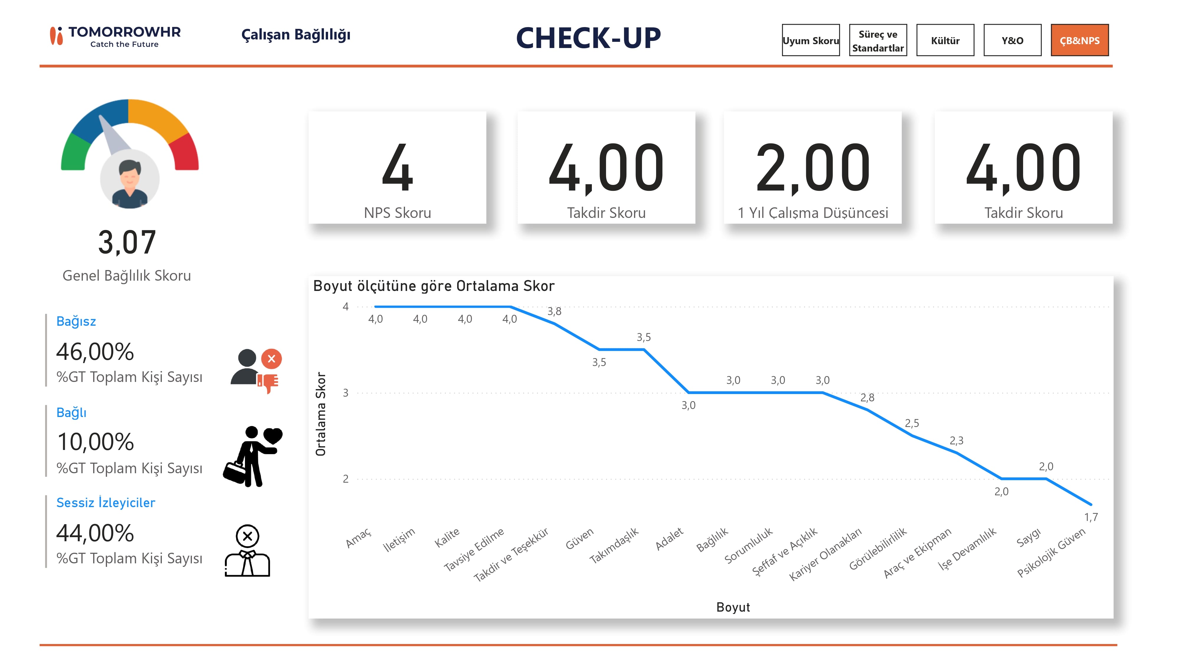 Check-Up analizleri, çalışanların kuruma olan bağlılık düzeyini objektif biçimde ölçmek için kullanılan veri temelli yöntemlerdir. “Bağlı – Bağımsız – Sessiz İzleyici” gibi segmentasyon modelleri sayesinde kurumlar, çalışan duygularını daha iyi anlayabilir ve bu içgörüye uygun stratejiler geliştirebilir.